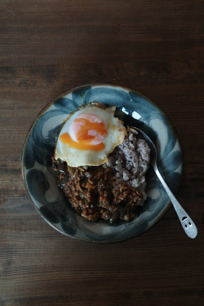 これはなんでしょう、、、茄子のキーマカレーっぽいけど、こんな照り照りするかな、、、?麻婆茄子かも?目玉焼きは白身のところが茶色くなってるので、たぶん同じプライパンの端っこのほうで適当に焼いたんだと思います(笑)