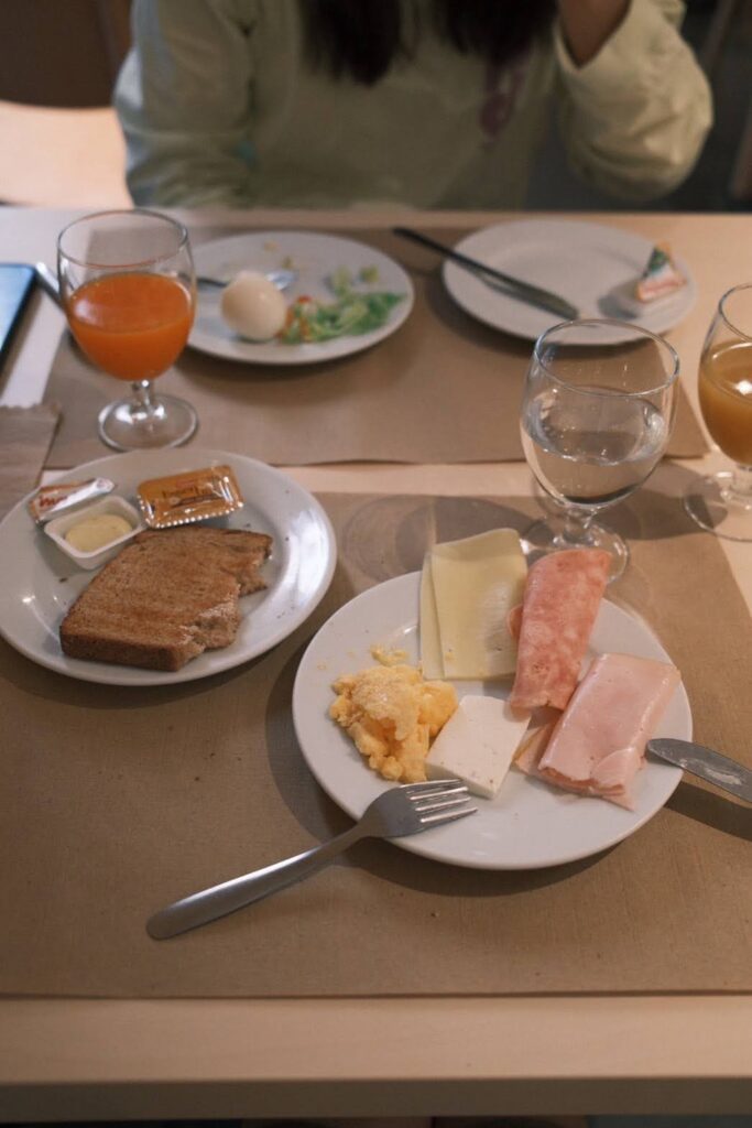 ホテルのビュッフェ初日、朝食会場も可愛いし、料理も全部美味しそう、パンもおかずもデザートまで種類が豊富で素晴らしい、、、!うわ〜!あれもこれも食べたい!となったけど、5日間もあるぞ、と一旦冷静に。