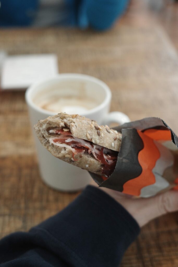 早朝にホテルを出て空港だったので、空港でイベリコハムが挟んであるバケットと、cafe con lecheを。ラストスペインだったので、最後までcafe con leche ,por favor で注文したのに、お兄さんにはcafe latte?って聞き返された。