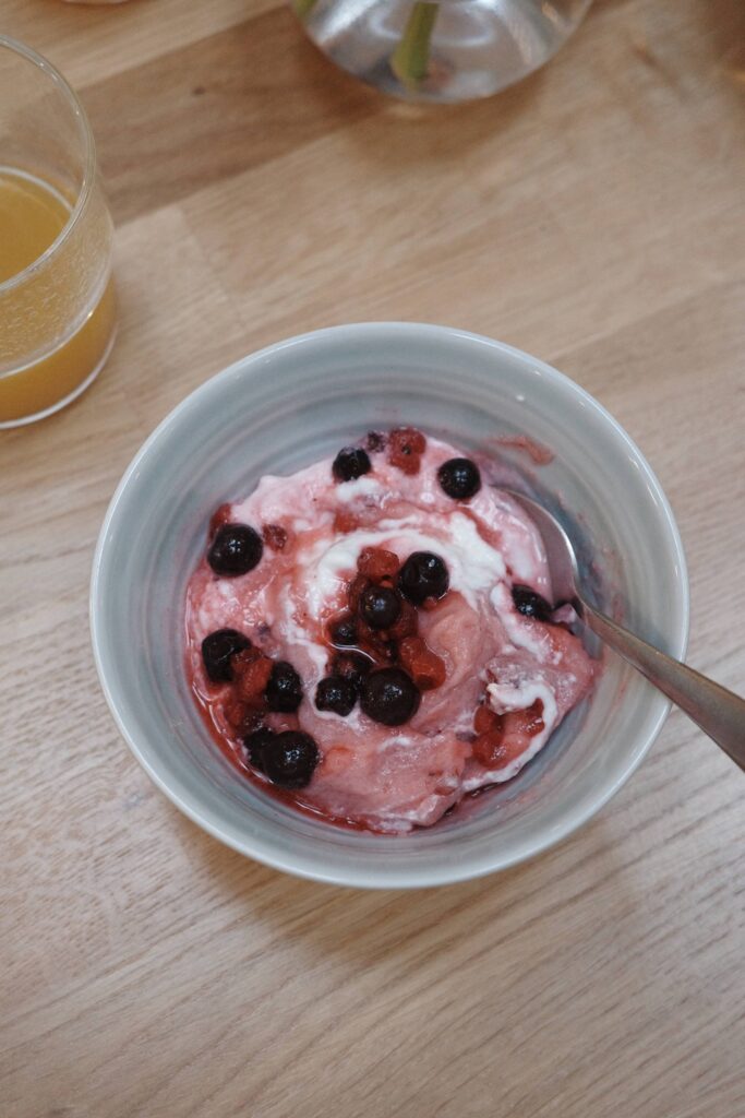 ヨーグルトとベリーは福田里香さんの冷製スープの写真をイメージして盛り付けて混ぜてみたけど、理想どおりにはできなかった。